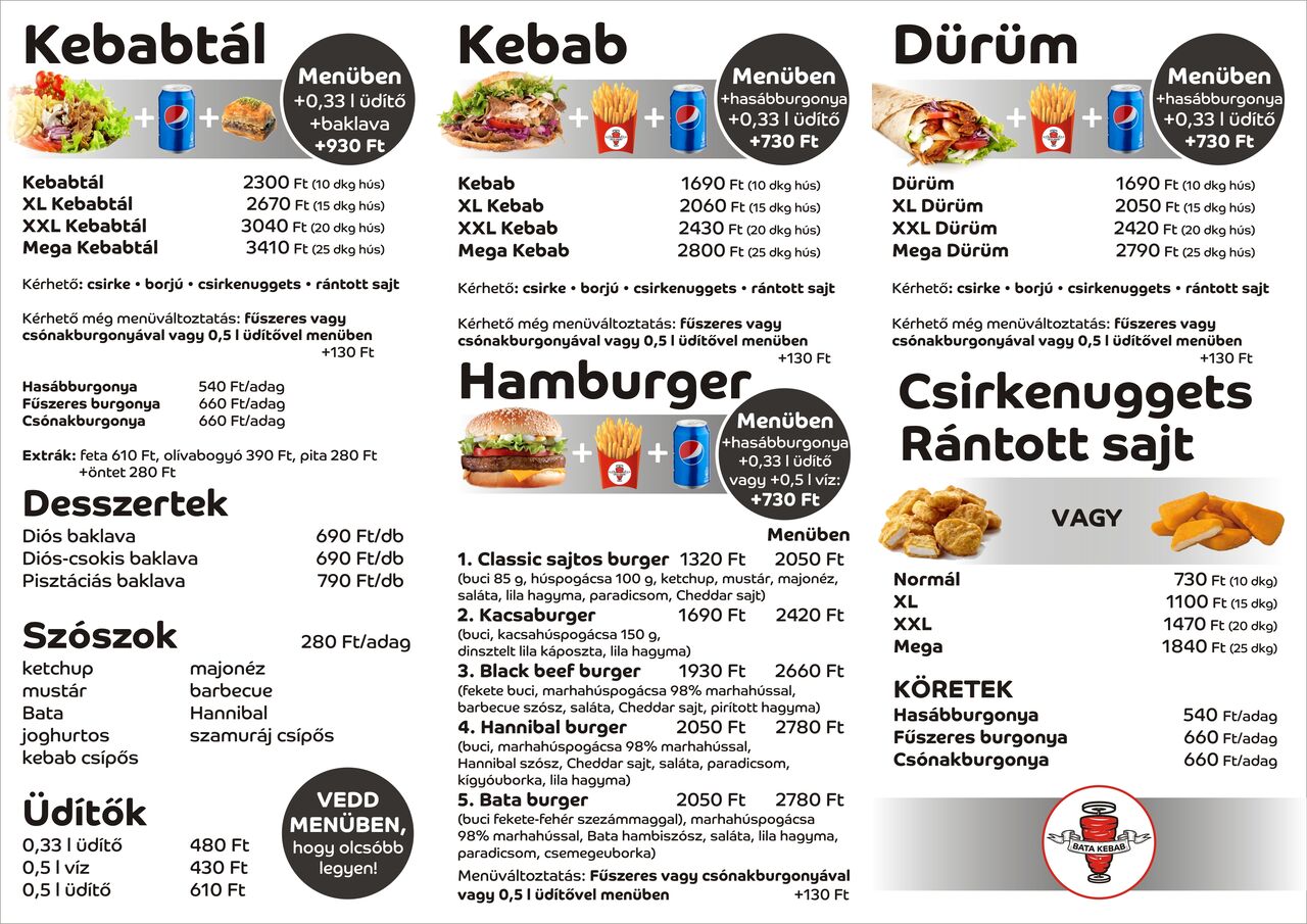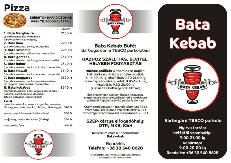 Üdvözlünk a Bata Kebab-nál, ahol 2021 óta várunk street food ételeinkkel a Sárbogárd Tesco parkolójában. Rendelhetsz elvitelre vagy házhozszállítással, hogy otthon is élvezhesd finomságainkat. Fiatalos csapatunk gyors kiszolgálást és jó hangulatot garantál az egész nap szóló kellemes zene mellett. Esténként pedig a hangulatvilágítás teszi még kellemesebbé az élményt.
